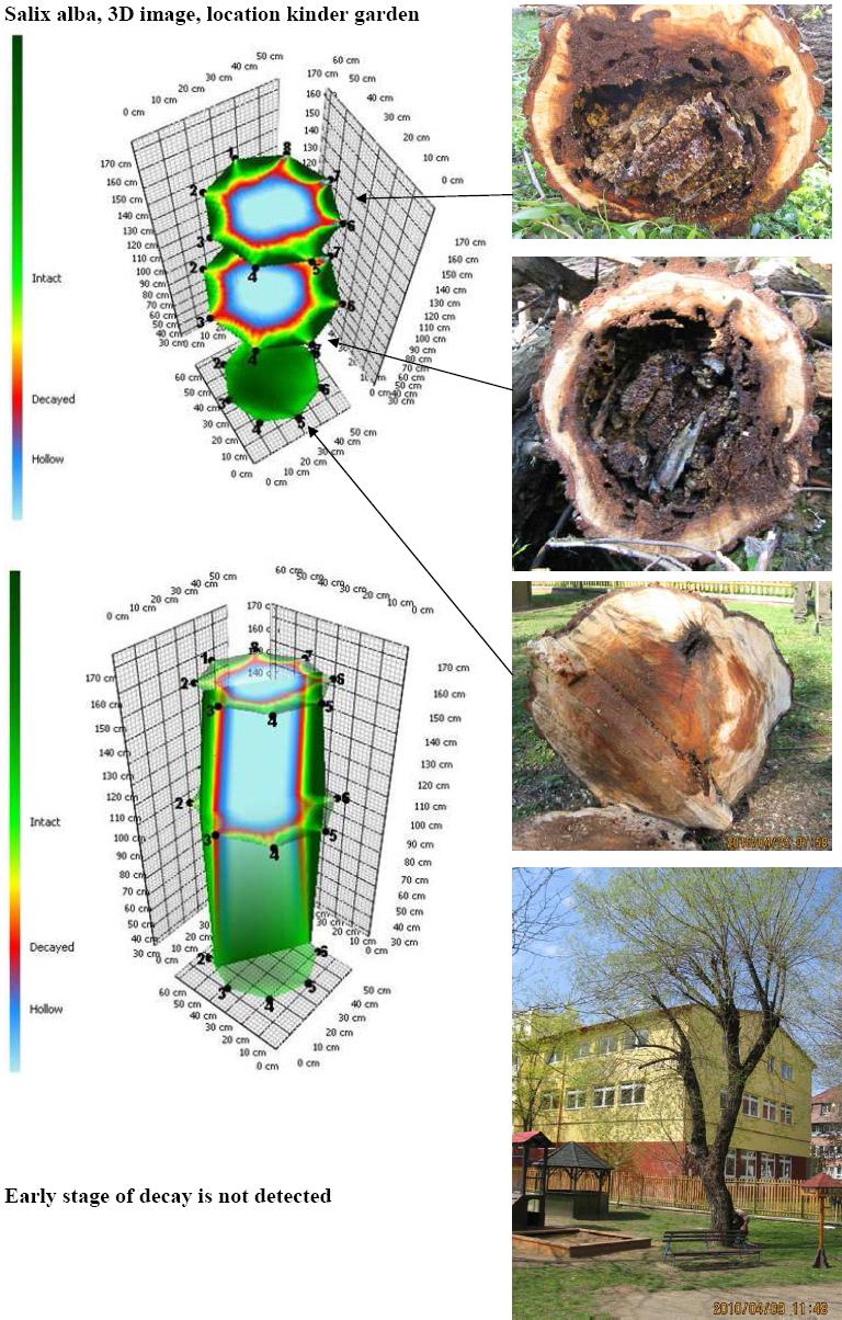 Fakopp 3D Acoustic Tomograph is able to non-destructively detect the size and location of decayed or hollow parts in the trunk. It works based on sound velocity measurement between several sensors around the trunk. The basic measurement principle is that sound velocity drops if there is a hole between two sensors.